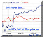 flat-lined. HP's "victory" in a quest for 3Par, a small storage company nobody's heard of before the HP-Dell bidding war broke out a few days ago, came earlier this morning, when HP raised its bid by $3 per share to $33 per share. That would put the total price at between $2.1 billion and $2.4 billion, depending on which valuation you prefer. You can see on the chart (right) how the market reacted to both news: Dell - up, HP - flat. It Was All About Three's in the End When a "lame duck" Board of a