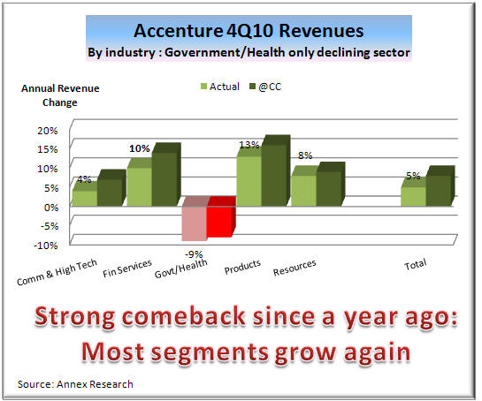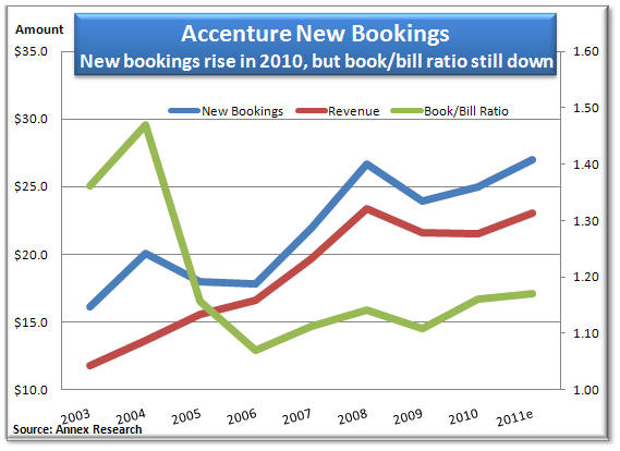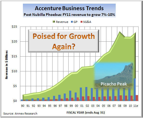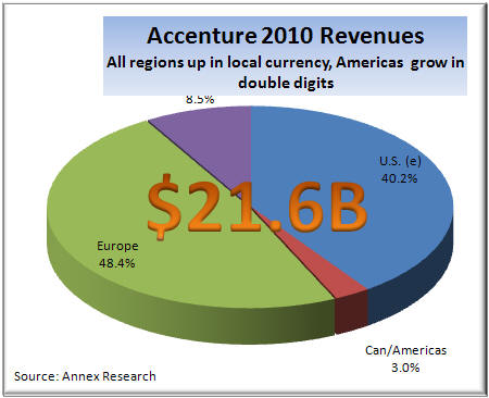 Updated 10/03/10, 4:30PM HIT, adds CEO's comment on SMB, emerging marketsAnalysis of Accenture's Fourth Quarter and Full Fiscal Year 2010 ResultsPoised for Solid Growth AgainStrong Finish in FY2010 Heralds Bullish Outlook for Next Year, But Aggressive Expansion May Threaten QualityHAIKU, Maui, Oct 1 – Recession? Retrenching? Cutbacks? Not at Accenture. On the contrary. Expansion is the name of the game at the IT services industry's third largest company. Accenture has just reported strong fourth quarter fiscal 2010 results, has hired enough new employees to populate a nice size town, and has said the business is poised for solid growth again. "If you look at confidence of executives in their business, people have pretty much run as long as they can without making major investments," said Bill Green, Accenture's CEO, during a post-earnings teleconference with analysts. "And so we think that 2011 is going to be fairly robust in terms of business spending on important initiatives." If that were to happen,