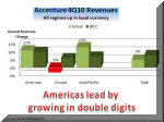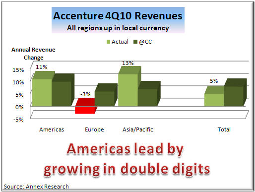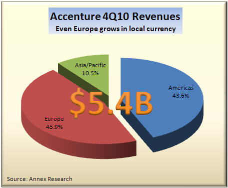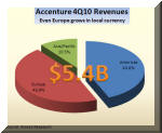 As you can see from the above chart, the higher the employment, the lower sales productivity has been in the last decade. That's because the rate of hiring expansion has exceeded that of the revenue growth. But that's only a part of the price one has to pay for being aggressive. The second part may be even more troubling... Quantity over Quality? "Wait a minute, wait a minute," as Danny DeVito might have famously uttered as one of his American-Italian characters. "Where do you round up 132,000 people in a such hurry?" Well, probably not in North Dakota or Wyoming. You find them where there are the most people... in places like India, the Philippines, Eastern Europe, Latin America... Asked by an analyst if most of the new hires were offshore, Craig, the CFO, confirmed that, "yes, the majority were there, but we did hire pretty nearly everywhere, including a lot in the US." The Accenture executive didn't elaborate on what "a lot" meant. And nobody pressed her to quantify such a vague comment. The question that we pondered, however, was, "where do you find 132,000 GOOD people in such a hurry?" And the answer is - you don't. So we wonder if Accenture is now putting quantity ahead of quality? For years, the company has been held up even by its competitors as a model of a high quality operation. A major reason for that has been its winning culture, which was protected and applied consistently across the company. Adding 132,000 people over a two-year period is equivalent of having several complete blood transfusions. Take into account about a 15% to 17% annual attrition, and you end up with a new body and a different culture under the same name. So what, you say? Bigger is better. Not necessarily. Not in the services game. That's where quality is not only everything; it is the only thing that will assure a contract renewal. The main danger of such an aggressive expansion is that the quality of service may suffer. Preventing that is also the main challenge the Accenture leaders face. No business automation aids we have seen so far in the marketplace can offset the value of a competent person. And putting 132,000 rookies on the line has got to dilute the quality of the entire team. There's just no two ways around it. It is interesting that no analyst broached that subject during in the Q&A session at the post-earnings teleconference. As usual, Wall Street seems ready to lap up any sap companies dish out. We cannot help but wonder, however, how many Accenture clients may be also asking the same question: Is their vendor of choice now putting quantity over quality? "Robust Demand" Expected in 2011 from New Business Functions Meanwhile, one reason Accenture is so bullish about the future is that they see the renewed demand for their services as self-generated. Which means it is a repeatable and a dependable basis for future plans and forecasts. "A lot of this demand we went and created," Green, the CEO, told the analysts. "And we created it by having very specific offerings that deal with specific problems in specific industries." "As the economy does come back... it's coming back looking different," he continued. "And that's what's driving the demand: business model changes, and delivery channel changes and things like that." "I think we're going to see consistent budgets for the traditional work, but we're going to see budgets that don't necessarily come out of IT but come out of marketing or engineering or manufacturing to do the new things, to sort of reinvent delivery models, production models and operating models." Asked in a subsequent email how important the SMB (small and medium size business) and the emerging markets are in Accenture's scheme of things, Green replied that, "SMB is not a big swinger for us. Emerging markets is, and the growth rate is very high but on a smaller base." So while other vendors, like IBM and HP, are focusing on expanding their businesses to Africa, China, etc., Accenture is trying to milk the old cow - developed markets - using new techniques. "I insist (on) two things," Green continued. "That we never lose our ability to innovate or to grow organically in the most developed and penetrated markets… (where) we still have huge headroom. We reinvent in the developed markets to be most relevant. If you do not do that, then you have to head for the developing." In other words, developed markets are still Accenture's Plan A. Which makes sense since that's where most of the money still is. Emerging markets are a Plan B. No wonder, therefore, that even in places where other vendors are reporting sluggish demand, such as in Europe, for example, Accenture's creativity seems to have found a way to unlock the client's treasure troves. "We've been pleasantly surprised by the demand in Europe," said Green during the teleconference. "Every day you read the paper, you see something and you start to worry. But frankly, the big companies operate on a Pan-European and on a global stage. Elements of their business are doing exceptionally well. People might be a little slow on the hiring, but they're not slow on the capital expenditures. I mean, people are investing in their business... We feel a lot better about Europe than what you read in the newspaper." Indeed, Accenture's fourth quarter results in Europe bear out this assessment. Business was up 6% in local currencies on the Old Continent even though European revenues declined 3% as reported in U.S. dollars (to $2.2 billion). In the Americas, Accenture experienced double digit growth in both U.S. dollars and local currency. Fourth quarter revenues surged 11% to $2.5 billion (up 10% in local currency). Business volumes were also robust in Asia/Pacific. They were up 13% to $688 million (up 7% in local currency). Business Segment Highlights Among Accenture's two horizontal segments, Consulting net revenues were $3.1 billion, an increase of 6% in U.S. dollars and 9% in local currency, while Outsourcing net revenues rose 4% in U.S