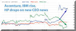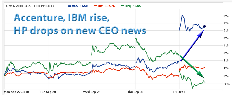 Meanwhile, Accenture's fourth quarter revenues rose 5% in U.S. dollars to $5.42 billion (up 8% in local currency), while net earnings surged 67% to $504 million. New bookings were also strong at $6.5 billion, a total of $25 billion for the full year. The markets liked what they heard from Accenture on Thursday night. The stock jumped nearly five points on Friday. IBM shares also rose buoyed by Accenture executives' bullish comments. IBM is due to report its third quarter results later this month. But Accenture's optimism was not enough to offset the cold reception that the new HP CEO, Leo Apotheker, received on Wall Street. HP shares dropped on the news despite a generally strong stock market day (see above charts). Putting Its Money Where Its Mouth Is How many times have you heard some company executives spout off about how great their business is only to lay a bunch of people off in the coming months or years? Not walking its talk has become almost a rule on perverted Wall Street. Well, that's clearly not the case with Accenture. There is no question that the company is bullish about its future again. And not just in words. For, words are cheap. The IT services industry's third largest IT firm is putting its money where its executives mouths are. "We hired roughly about 64,000 people this past year, and we see 2011 shaping up to be similar," said Pam Craig, Accenture's CFO, during the analyst teleconference. The 2010 hiring spree boosted Accenture's global payroll by 14% to over 200,000 employees. And if its 2011 expansion plan comes true, the company will have grown its employment by about 27% in just two years. So nobody can accuse Accenture of not putting its money where its mouth is. But there is a price for such a massive expansion. First, in lower sales productivity. Second, in potential quality erosion.