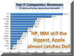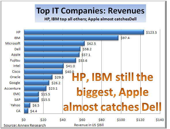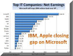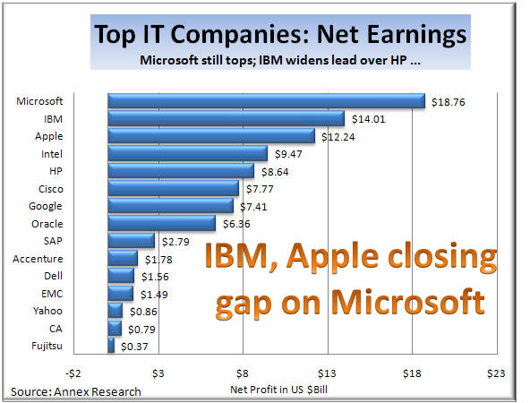 Microsoft, Dell and Apple are now neck-and-neck in No. 3-5 positions in the industry, well back of HP and IBM. Fujitsu is No. 6. And so on... As for net earnings, IBM and Apple are closing the gap on Microsoft (left chart). Intel, HP, Cisco, Google and Oracle are all bunched up in the $6 billion to $10 billion range. Fujitsu. the sixth largest company in terms of revenues is dead last when it comes to profitability. Apple, Oracle and Intel are