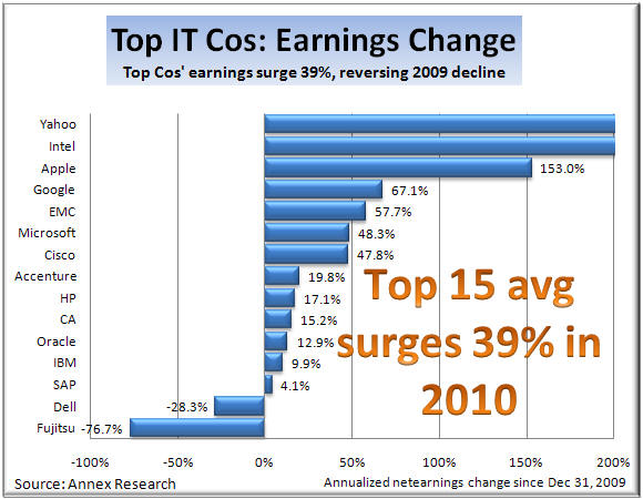 do Apple's net earnings are also the fastest growing in the industry, up 153%, although that may not be apparent from the chart on the left. That's because Yahoo and Intel are ostensibly No. 1 and No. 2 in this respect, but only because their 2009 profits were so dismal. Apple, on the other hand, had a good year in 2009, and a great one so far this year.