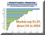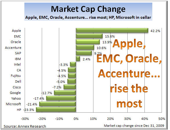 Updated 10/11/10, 6:00PM HSTAnalysis of Top Global IT Companies' Market & Business PerformancesMove over Microsoft, Apple Takes the PoleMicrosoft No Longer Market Cap King; Apple, IBM, Oracle, Intel, Accenture Gain; HP, Dell, Cisco Drop in RankingsTop IT Companies' Market Cap Drops 1% Even As Their Earnings Surge 39%, Revenues Rise 10%, Equity Up 16% HAIKU, Maui,