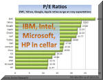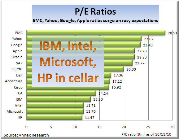 private little ra The price/earnings (P/E) ratio rankings also show that the investors regard Microsoft, HP, Intel and IBM as the "old guard." The four industry giants are holding up the rear relative to other competitors. Considering that the "Four Musketeers" still make oodles of billions of dollars in net profits, that hardly seems justified or fair. But "all's fair in love and war," as they say. And stock market trades on emotions just as if it were love and war. IBM Stock Still Undervalued? A year ago, we also noted that IBM stock, for example, was undervalued relative to its peers. Big Blue shares were trading at under $120 at the time. We said they should be worth at least $137 (see "Rally of Hope over Fact", Oct 2009). Well, IBM closed at $139.66 today. Yet it still looks undervalue relative to the IT industry market cap leaders. Apple, Google and Oracle are trading at P/E ratios of 22-23. IBM's is 13 (see the table below).