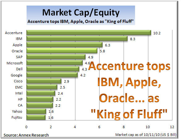 At the end of 2009, the Fluff Ratio for the top 15 IT industry leaders stood at 4.6. Now, it is down to 4.0. Partly, that's because the higher earnings that Wall Street was predicted have resulted in increased equities, which are up 16% since the start of the year. But also, by scaling down their expectations about the future, the investors are removing excess "fluff" from the market. Meanwhile, the industry's