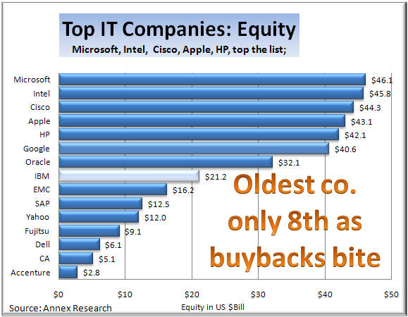 oldest company - IBM - is only eighth in terms of equity. Even a relat Basically, Big Blue is giving its wealth away almost as fast as it is making money. So forget the old-fashioned way of squirreling money away, or reinvesting it more aggressively in one's own business. BUSINESS Rankings of Annex Top IT CompaniesThe pecking order at the top